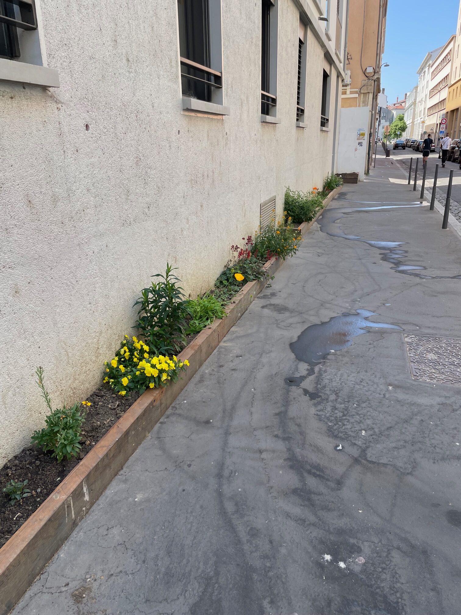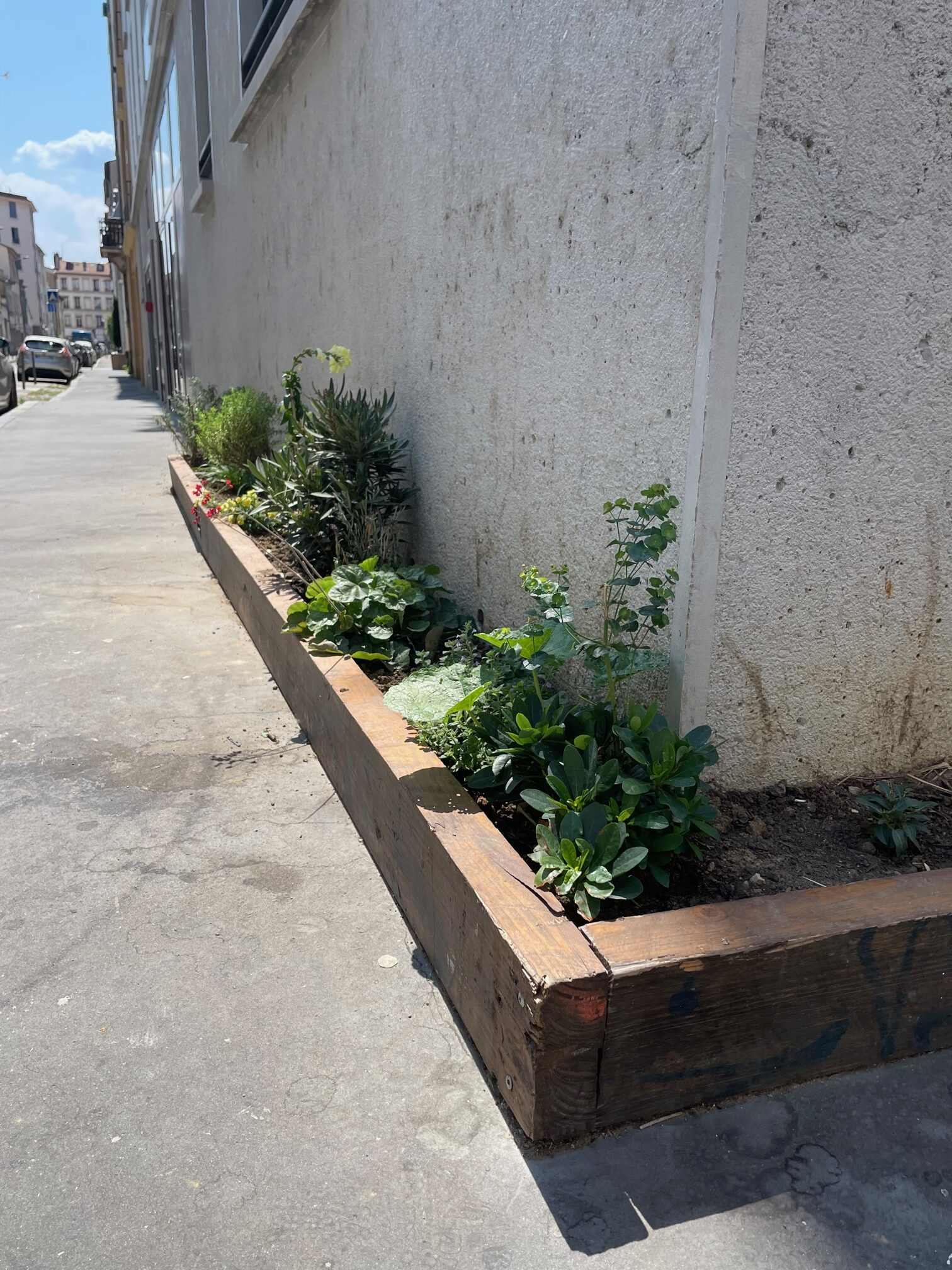 Une fois le groupe de voisins et voisines motivé, et après leur inscription et la validation de leur dossier, les services de la mairie sont venus casser le béton. La terre ainsi que les fleurs pour les premières plantations ont été fournies par la ville. «Ensuite, on a construit des bacs, que trois membres du groupe ont créé de toutes pièces avec du bois issu de Minéka, une association qui fait du réemploi de matériaux venant du BTP » raconte Marion. Pour le format, tout est possible : Marion et ses voisins ont décidé de creuser des fosses tout au long de leur immeuble, formant un L. Si auparavant, les fosses se contentaient de petits rectangles étroits de 20 x 60 cm, il est aujourd’hui possible d’avoir des surfaces à la fois plus larges, et beaucoup plus longues, comme celles de Marion, qui contiennent un plus grand volume de terre. Un atout pour le développement des racines, et la conservation de la fraîcheur de la terre en été.